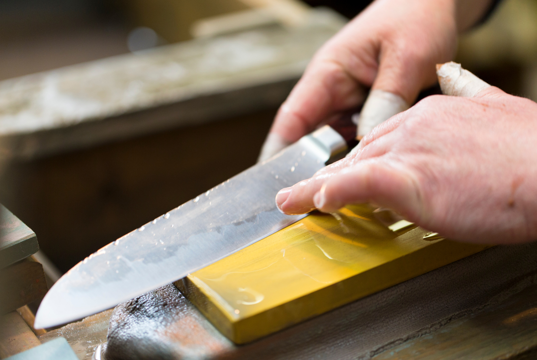 We use a two-step process—starting with an electric sharpener and finishing by hand on stone and steel for a precise edge.